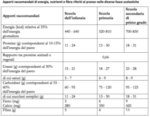 Di seguito riporto la tabella con gli apporti raccomandati per le diverse fasce d’età da tenere presente nel pranzo a scuola.