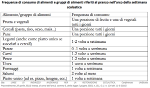 Di seguito riporto la tabella con gli apporti raccomandati per le diverse fasce d’età da tenere presente nel pranzo a scuola.