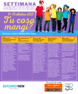 Eutourist New Srl è un’azienda della galassia All Food, che gestisce la ristorazione scolastica del I Municipio di Roma Capitale. Eutourist New ha concordato con i Servizi educativi dell’AC la proposta di dedicare una settimana alimentare, dall’11 al 15 ottobre 2021, a piatti tipici di altri paesi. La proposta nasce come percorso di educazione alimentare affinché le bambine e i bambini possano essere accompagnati al rafforzamento della multiculturalità e alla conoscenza delle tradizioni alimentari di tanti loro coetanei.